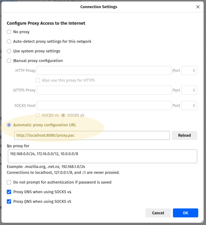 The proxy definition file is available on your local computer at http://localhost:8080/proxy.pac. Important: the port 8080 has to be in line with the Docker settings as explained above. It might be that on your local system, it is not port 8080 but maybe 8079, 8078 or 8081 (or anything else around 8000). To use this proxy file and to be able to browse the I2P and Tor network, open your browser settings and set it like this:
