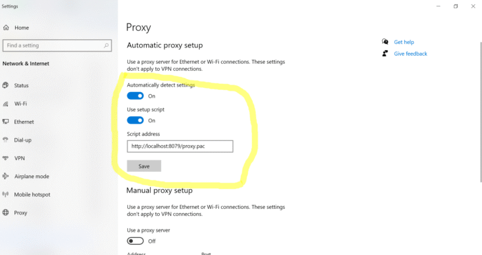 The environment variables are used to configure your “proxy” definition file on your computer. Such a proxy definition file (a “.pac” file) is useful to configure your browser (like Firefox or Chrome). It will be shown further down how to use this proxy definition file. Note that the environment variables must be in line with the port settings.