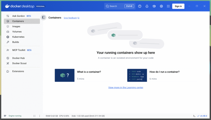 Now, as soon as you have Docker Desktop started on your computer, it will look initially like this:
