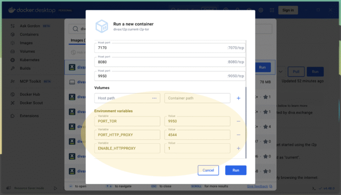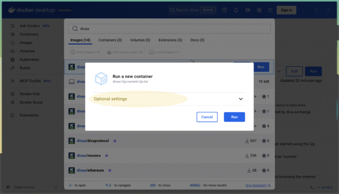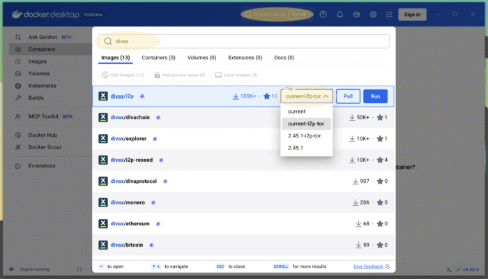 Your Docker Desktop application features a search function on top. There you search for “divax/i2p” and choose the i2p image using the tag “current-i2p-tor”. This looks like this: