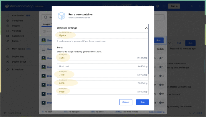 Now hit the blue “Run” button. The Docker image for I2P will be downloaded (known as “pull”) from the official Docker repositories. After the download has finished, you will be asked to setup your new container. Set the “Optional Settings” correctly, which looks like this: