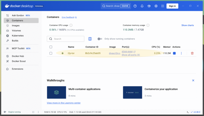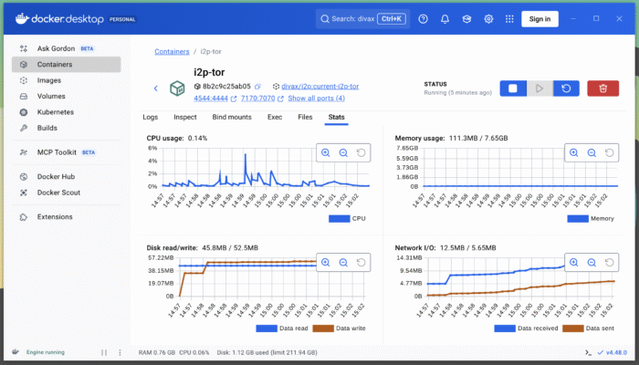 By double-clicking on a running container, like i2p-tor, you get access to all the details of what’s happening within the container. Statistics are available and look like this: