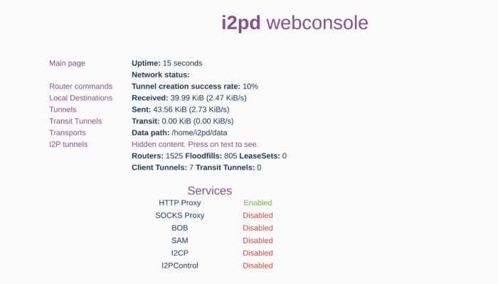 As you have now I2P available and running within a container, you can open a browser of your choice (like Chrome or Firefox) and navigate to http://localhost:7170. The address “localhost” points to your own computer, and the port 7170 is the one you have set as a parameter when you started your Docker container. Your browser will then display the I2P web interface, which looks like this: